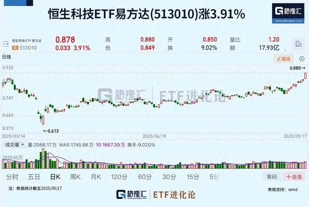 投资于中国科技核心资产的恒生科技ETF易方达(513010)涨3.91%,年内涨幅超40%。