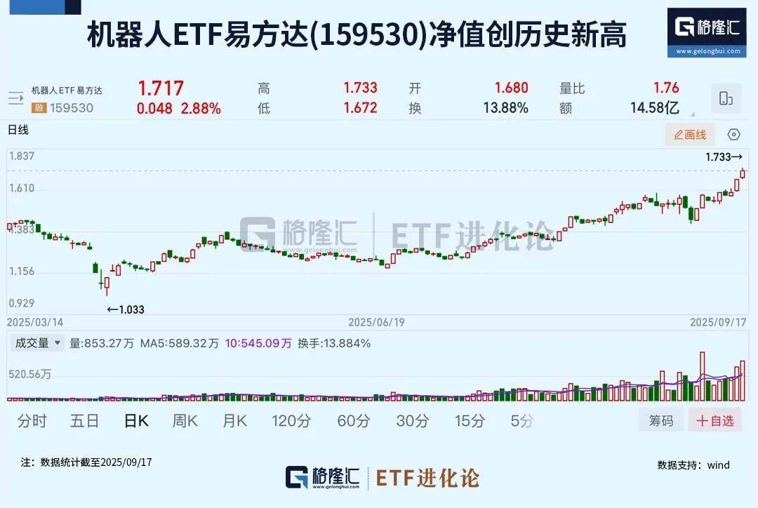 机器人ETF易方达(159530)今日上涨2.88%,近9个交易日涨18%,年内涨幅47.38%,净值创历史新高。