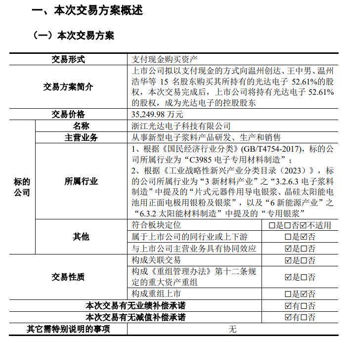 草案称,光达电子作为光伏金属化综合解决方案的领先厂商,产品技术水平位居行业前列。报告期内标的公司经营业绩快速增长,在重点客户的出货量及市场份额稳步提升。上市公司实际控制人家族持续深耕电学金属材料,若本次交易成功实施,上市公司将在电接触行业的触头材料、复层触头、触头组件基础上,新增电子浆料业务,进一步丰富电学金属材料产业链,有助于上市公司打造业绩第二增长曲线,提高公司的整体竞争力,符合国家产业政策和公司发展需求,符合公司及股东利益。光伏行业在全球双碳目标持续推进以及国内外利好政策的带动下,正处于高质量发展期,导电浆料作为核心辅材将迎来快速发展机遇。标的公司具有较高的市场地位与较强的盈利能力,若本次交易成功实施,将借助上市公司平台获得多方面的协同支持,进一步释放业务发展潜力。上市公司通过本次交易其资产规模、营业收入与净利润水平将显著提升,基本每股收益亦得到增厚,整体盈利能力和综合竞争力进一步增强。综上,本次交易对上市公司未来发展具有积极意义,符合全体股东的利益。